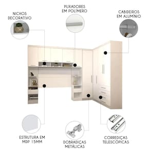 Conteúdo da Embalagem: 1 Guarda Roupa, 1 Canto Reto, 2 Mesas Cabeceira Alta, Sapateira, 1 Armário Aéreo, 2 Painéis Cabeceira.