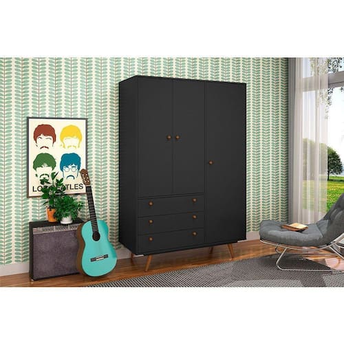 Guarda Roupa Retrô 20 Preto Ac / Preto AcGuarda Roupa Retrô 20, possui porta de rotação em MDF, prate+AG15:BE15leira interna, suporte para cabides em alumínio, gavetas puxadores em madeira,Possui pés palito em madeira trazendo o design retrô.Cor: Preto Ac/Preto AcEscala de brilho: AcetinadoDimensões (AxLxP): 181,8 x 122,5 x 51,5cmMaterial da estrutura: MDP 15 MM e MDF 15/25 MMAcabamento: UVPeso do produto montado KG: 82KgNecessita de montagem? SimQuantidade de prateleiras: 1Tipos de prateleiras: FixaQuantidades de gavetas: 3Quantidades de portas: 3Tipos de portas: RotaçãoQuantidade de puxadores: 9Material dos puxadores: MadeiraRodízios: Não possuiQuantidade de pés: 4Tipo dos pés: Pé palito em madeiraAltura os pés: 17cmSuporta até (KG): 40KgEspaço para TV: -Acompanha suporte TV: NãoPossui furação para passagem de cabos: -Tamanho máximo de TV: -Possui manual de montagem: SimRecomendação de limpeza: Com pano umedecido. Não aplicar lustra móveis.Volumes: 3Garantia: 3 meses Guarda Roupa Retrà 20 Preto Ac / Preto Ac