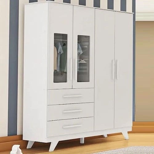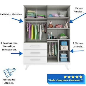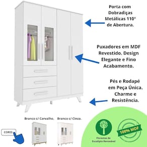O Guarda Roupa Infantil Retro é a solução perfeita para quem procura organização, segurança e beleza em um só produto. O Guarda Roupa Retrô 04 portas e 3 gavetas é um produto 100% MDF, sua pintura é atóxica, possui cabideiros metálicos, puxadores em MDF revestido, divisórias de gavetas (vendidas separadamente), corrediças telescópicas e portas com PETG cristal.FICHA TÉCNICA-Guarda Roupa Infantil RetrôAltura: 209,6 cmLargura: 154,8 cmProfundidade: 49,8 cmQuantidade de Gavetas: 03 Gavetas (Peso suportado 4Kg)Quantidade de Portas: 04 PortasMaterial: 100% MDFCores Disponíveis: Branco Brilho / Branco Brilho com Carvalho / Branco Brilho com CinzaAcabamento do Produto: Pintura UV Atóxica/ Pintura PU e Fita de BordoAcabamento das Portas: Lisa Pintura UV AtóxicaTipo de Corrediça: Corrediça TelescópicaTipo de Cabideiro: Cabideiro MetálicoTipo de Puxadores: MDF revestidoTipo de Pés: MDFRodapé: Desenho RetrôEmbalagem: Peças envoltas em isomanta, caixa de papelão revestidas com plástico termoencolhívelManual de Montagem: Manual segue na embalagem do produtoGuarda-Roupa Suporta Até (kg): 60 kgRecomendações de Uso, Manutenção e Limpeza:Para limpeza utilize somente pano limpo e macio, ligeiramente umedecido em água (apenas o bastante para remover a poeira), seguido de um pano seco.Perguntas Frequentes:A - É fácil montar o Guarda Roupa Infantil Retrô da Móveis Peroba?Nível de complexidade alta, sugerimos a contratação de um montador especializado. Nós não realizamos a montagem dos produtos e não oferecemos esse serviço.B - Tenho a opção de comprar Berço ou Cômoda Infantil Retrô separado?Sim, só buscar aqui no site que vai encontrar nossa oferta.C - Qual a configuração do Guarda Roupa Infantil Retrô da Móveis Peroba?Guarda Roupa infantil Retrô com 3 gavetas e 4 portas.D - Como organizar a Guarda Roupa Infantil Retrô?Você vai naturalmente encontrar a melhor maneira de organizar seu Guarda Roupa.Entretanto, vale a pena pontuar algumas situações:1-A Guarda Roupa deve estar sempre limpo*;2-Primeira Gaveta: Utilize para os produtos de Higiene do bebê;3-Demais Gavetas: Utilize para roupas e acessórios do bebê.4-Nos cabides as roupas maiores e roupas com usos menos frequentes e nos nichos e prateleiras artigos e objetos de uso diários.E- Quais as cores disponíveis para o Guarda Roupa Infantil Retrô da Móveis Peroba?Temos nas cores Branco Brilho / Branco Brilho com Carvalho / Branco Brilho com CinzaF - Onde é fabricado o Guarda Roupa Infantil Retrô?O Guarda Roupa Infantil Retrô é fabricado na cidade de Linhares-ES, pela Peroba Móveis Infantis.A Peroba é atualmente uma das maiores fábricas de Móveis Infantis da América Latina.