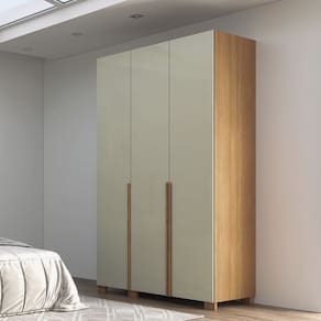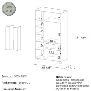 Características: Estrutura 100% MDF Acabamento em Pintura UV 02 Gavetas Internas Corrediças Telescópicas Puxadores em MDF Cabideiro em Alumínio 03 Portas Articuladas Dobradiças com Amortecedor Prateleiras Pés em MDF