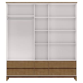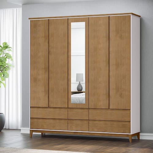Características: Estrutura em MDF de 15mm Pintura Acetinada Verniz PU e UV 05 Portas Dobradiças Metálicas com Amortecimento 06 Gavetas com Corrediças Telescópicas Portas e Gavetas com Puxador Cava Cabideiro em Alumínio Frentes de Gavetas e Portas em Madeira Maciça Portas em Baixo Relevo com Perfil de Anti-empeno Porta Central Possui Espelho Pés Exclusivos em Madeira Maciça Peso Máximo Suportado pelas Gavetas 05kg Distribuídos Peso Máximo Suportado pelas Prateleiras 10Kg Distribuídos Isolamento de Peças com Manta de Polietileno Expandido (Isomanta)