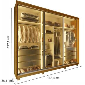 Estrutura: 100% MDFAcabamento: Pintura U.V, de alta resistência, que assegura durabilidade e beleza ao acabamento Porta: Sim, 03 portas de correr (deslizantes) com vidro reflectaGavetas: Sim, 06 gavetas com corrediças telescópicas LED: sim, luz de LED, na cor quente, nas laterais e divisórias Cabideiro: Sim, cabideiro em alumínio, espaço para vestidos Divisão: Interna ele/ela na cor OFF White Puxador: Sim, tipo perfil em aço Pés: Sim, 08 pésDimensões do produto montado