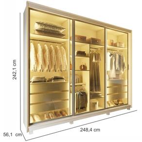 Estrutura: 100% MDFAcabamento: Pintura U.V, de alta resistência, que assegura durabilidade e beleza ao acabamentoPorta: Sim, 03 portas de correr (deslizantes) com vidro reflectaGavetas: Sim, 06 gavetas com corrediças telescópicasLED: sim, luz de LED, na cor quente, nas laterais e divisóriasCabideiro: Sim, cabideiro em alumínio, espaço para vestidosDivisão: Interna ele/ela na cor OFF WhitePuxador: Sim, tipo perfil em açoPés: Sim, 08 pésDimensões do produto montado