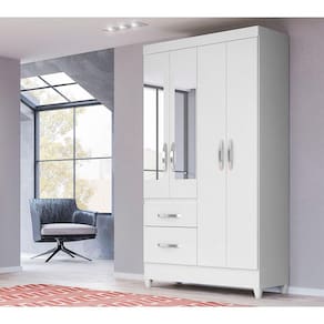 Características Estrutura em MDP de 12mm. Pintura em Acabamento UV. 04 Portas articuladas com dobradiças metálicas. 02 Gavetas com corrediças metálicas. Cabideiros em madeira. Amplo espaço interno com prateleiras. Puxadores na cor bronze. Pés em PVC. Acompanha espelho.