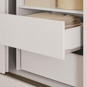 Fabricado em MDP 12 mm com acabamento em verniz brilhante e proteção UV, o roupeiro garante durabilidade e fácil limpeza. As portas deslizam suavemente sobre trilhos em ABS, otimizando o espaço do ambiente.