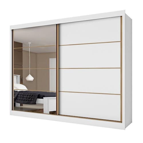 Caracteristicas: Cabideiro e Calceiro interno em alumínio 6 gavetas telescópicas 8 Prateleiras Removíveis 2 portas deslizantes Porta com espelho Modelo:Sevilha Matéria-prima: MDF Revestimento: Impressão com Verniz UV Acabamento: Semi brilho Portas: 2 Deslizantes Trilhos: Alumínio e plástico Corrediças: Telescópicas