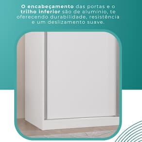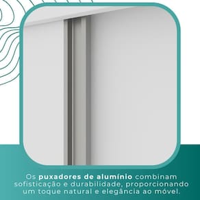 Estilo: modernoMaterial principal: MDF 15 mmEspessura do fundo e fundo da gaveta: 3 mmAcabamento: pintura texturizada UVEscala de brilho: foscaPortas: 2 portas de correrTipo de puxador da porta: embutido: Sim, de uma lado da cor do predominante do produto e do outro é Off-White.Número de prateleiras: 7Peso suportado por prateleira: 3 kgNúmero de gavetas: 3 gavetas internasTipo de corrediça da gaveta: metálica telescópicaPeso suportado por gaveta: 5 kgNúmero de cabideiros: 2Sistema de montagem: parafusos e cavilhas