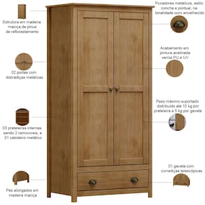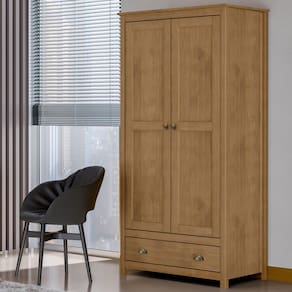 Fabricado em madeira maciça de alta resistência, esse guarda roupa 2 portas e 1 gaveta prova que espaços compactos podem ser incrivelmente funcionais e cheios de estilo. Com um cabideiro interno inteligente e prateleiras removíveis, esse guarda roupa americano se adapta às suas necessidades - seja para organizar camisas, calças ou acessórios. Para completar, a gaveta inferior mantém itens pessoais sempre à mão, mas discretos, enquanto os puxadores em concha acrescentam um toque especial ao design.
