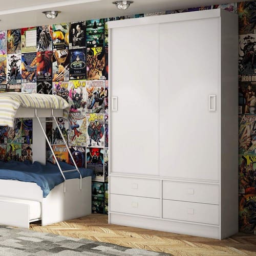 +Guarda+Roupa+Solteiro+2+Portas+4+Gavetas+em+MDP+branco+com+espessura+de+15mm+%28laterais+e+prateleiras%29%2C+acabamento+em+Laca+nas+portas+e+na+frente+das+gavetas.+Gavetas+com+corredi%E7a+telesc%F3pica+e+portas+com+trilho+de+alum%EDnio. Acabamento da Prateleira: Finish Foil Escala de Brilho da Prateleira: Semi-Brilho Possui Cabideiros: 01 Acabamento da Gaveta: Laca Escala de Brilho da Gaveta: Brilhante Possui Organizador de Gaveta: Não Acabamento da Porta: Laca : 210 cm Ambiente: Quarto Complexidade da Montagem: Média: pode ser montado por mais de uma pessoa e/ou necessite de maior conhecimento para montagem Cr: Branco Cr: Branco Cr Interna: Branco Escala de Brilho: Brilhante Gaveta com Chave: Não Itens Inclusos: 1 Guarda Roupa e Manual de Montagem. : 115,6 cm Material da Gaveta: MDP Material da Porta: MDP Material da Prateleira: MDP Material Principal: MDP Necessita Montagem: Sim Peso: 77 kg Peso Máximo por Gaveta: 3 kg Peso Máximo por Prateleira: 10 kg Possui Calceiros: Não Possui Espelho: Não Possui Gavetas: 04 Possui Pés: Não Possui Portas: 02 Possui Prateleiras: 02 : 45 cm Recomendações de Uso, Manutenção e Limpeza: É recomendado pano macio para limpezas do dia-a-dia, e pano úmido para tirar a poeira. Sapatas Niveladoras: Não Sistema de Montagem: Parafusos, cavilha, prego. Tipo de Corrediça da Gaveta: Metálica Telescópica Tipo de Dobradiça/Corrediça da Porta: Metálica Tipo de Gaveta: Externa Tipo de Porta: Correr Tipo de Puxador da Porta: Embutido