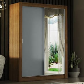 Itens incls: - Um (1) cabideiro metálico grande - Duas (2) prateleiras e quatro (4) nichos - Duas (2) portas de correr com puxadores em PVC, sendo uma de madeira e uma com espelhos