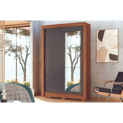 Guarda Roupa Solteiro 2 Portas de Correr (1 c/ Espelho) e 2 Gavetas c/ Pés Lapa Jatobá/Grafite - Santos Andirá