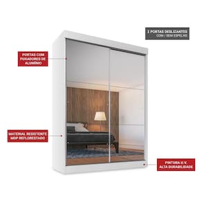 O Guarda Roupa Solteiro 2 Portas de Correr com Espelho 2 Gavetas é composto por duas portas com espelho dividido em três painéis. É um armário eficiente, possui múltiplas repartições para acomodar roupas e objetos, cabideiros e puxadores em alumínio, com o puxador acompanhando a altura da porta, guias superiores com molas, rodízios metálicos com roldanas em nylon e trilhos de alumínio que proporcionam melhor deslize das portas, 4 gavetas internas com corrediças metálicas, produzido em MDP com acabamento em pintura UV, proporcionando maior resistência e durabilidade. Os materiais utilizados são de primeira qualidade e respeitam o meio ambiente. Acabamento da Gaveta: Pintura Acabamento da Porta: Pintura Acabamento da Prateleira: Pintura Altura: 199 cm Altura do Espelho: 60,4 cm Ambiente Principal: Quarto Complexidade da Montagem: Média: pode ser montado por mais de uma pessoa e/ou necessite de maior conhecimento para montagem Cor do Produto: Branco Cor Interna: Branco Cor Predominante: Branco Escala de Brilho: Fosco Escala de Brilho da Gaveta: Fosco Escala de Brilho da Porta: Fosco Escala de Brilho da Prateleira: Fosco Espessura do Espelho: 3 mm Estilo: Moderno Formato do Espelho: Retangular Garantia: 06 meses Gaveta com Chave: Não Guarda-Roupa Suporta Até (kg): 77 kg Largura: 131,1 cm Largura do Espelho: 61,2 cm Largura do Espelho 01: cm Linha ou Coleção: Peônia Manual de Montagem e Instalação: https://cdn2.madeiramadeira.com.br/atributo/fama-moveis/899919-famamoveis-manualdemontagem-guardaroupasolteiropeonia-atualizado-1.pdf Material da Gaveta: MDP Material da Porta: MDP Material da Prateleira: MDP Material do Puxador da Porta: Alumínio Material Principal: MDP Montagem Flex: Não Necessita Montagem: Sim Peso: 104,5 kg Peso Máximo por Gaveta: 4 kg Peso Máximo por Prateleira: 7 kg Possui Cabideiros: 02 Possui Calceiros: Não Possui Espelho: Sim Possui Gavetas: 02 Possui Organizador de Gaveta: Não Possui Pés: Não Possui Portas: 02 Possui Prateleiras: 02 Profundidade: 55 cm Quantidade de Espelho: 06 Espelhos com Tamanhos Iguais Sistema de Montagem: Parafusos, Cavilhas, Pregos e Porcas Cilindricas Tipo de Corrediça da Gaveta: Metálica Simples Tipo de Dobradiça/Corrediça da Porta: Metálica Tipo de Fixação do Espelho: Silicone Tipo de Gaveta: Interna Tipo de Guarda-Roupa: Solteiro Tipo de Porta: Correr Tipo de Puxador da Gaveta: Embutido Tipo de Puxador da Porta: Externo
