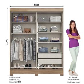 O Roupeiro 02 Portas Deslizantes B353 foi feito para agradar todos os gostos. Possui A 200 x L 159 x P 48 Cm, produzido em MDP, o produto possui portas reversíveis “Flex” e conta com Cabideiro resistente de madeira revestido, 02 gavetas com corrediças metálicas, puxadores em alumínio bronze e 02 portas deslizante com apliques ripados, é ideal para compor seu ambiente e trazer graça para o lar! Cor: Jequitibá/Preto Altura (cm): 200 Largura (cm): 159 Profundidade (cm): 48 Cor Interna: Trama Escala de Brilho: Brilho Ambiente: Quarto Acabamento: Pintura UV Texturizada Possui Vidros: Material Principal: MDP Produto Suporta até (Kg): 55 Kg Possui Espelho: Não Possui Gavetas: Sim - Quantidade: 2 Und. - Peso Maximo Suportado por Gaveta: 3 Kg Possui Pés: Sim Quantidade de Pés: 6 Und. - Material dos Pés: ABS Possui Portas: Sim - Quantidade: 2 Und. - Tipo: Correr Possui Prateleiras: Sim - Peso Maximo por Prateleira: 8 Kg - Quantidade: 5 Und. Recomendações de Uso, Manutenção e Limpeza: Para limpeza de seu móvel, use uma flanela limpa e seca. Não utilize produtos químicos que possam danificar o produto. Sistema de Montagem: Parafusos e Cavilhas Necessita Montagem: Sim Complexidade da Montagem: Alta: Deve ser montado por um montador especializado. Itens Inclusos: 1 Guarda Roupa e Instrução de Montagem Garantia: 90 Dias