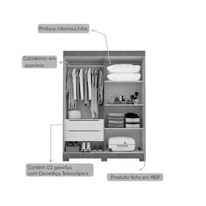 Material dos Cabideiros - Cabideira Metálico Quantidade de Portas - 2 Portas de Correr Tipo de Corrediça - c/ Corrediças Telescópicas Quantidade de Gavetas - 2 Gavetas Tipo dos Pés - ABS/PVC Quantidade de Prateleiras - 3