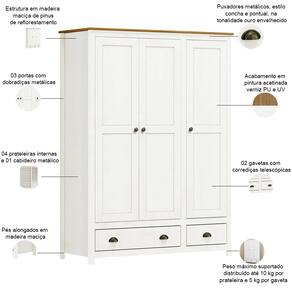 Fabricado em madeira maciça de alta resistência, esse guarda roupa 3 portas e 2 gavetas prova que espaços compactos podem ser incrivelmente funcionais e cheios de estilo. Com um cabideiro interno inteligente e prateleiras estratégicas, esse guarda roupa americano se adapta às suas necessidades - seja para organizar camisas, calças ou acessórios. Para completar, as gavetas inferiores mantêm itens pessoais sempre à mão, mas discretos, enquanto os puxadores em concha acrescentam um toque especial ao design.