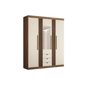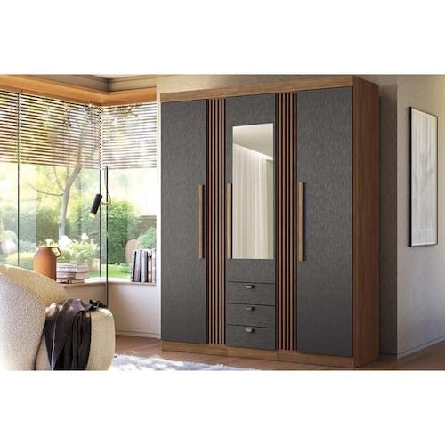 Material do Calceiro - Calceiro Metálico Tipo de Cabideiro - Aéreo Material dos Cabideiros - Cabideira Metálico Tipo de Porta do Guarda-Roupa - Portas de Bater Material das Portas - Portas em MDP Tipo de Dobradiças - Dobradiças Metálicas Diferenciais das Portas - Portas Ripadas Quantidade de Portas - 3 Portas de Abrir Quantidade de Portas com Espelho - 1 Porta com Espelho Tipo de Espelho - Espelho Externo Quantidade de Espelhos - 1 Espelho Material das Gavetas - Gavetas em MDP Tipo de Corrediça - c/ Corrediças Telescópicas Quantidade de Gavetas - 3 Material de Estrutura Fundo Gaveta - Em HDF Material das Prateleiras - Prateleiras em MDP Quantidade de Prateleiras - 5
