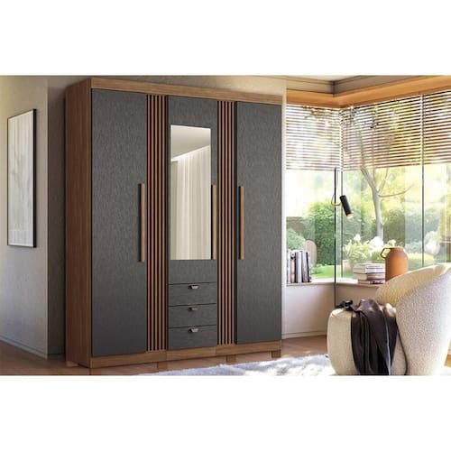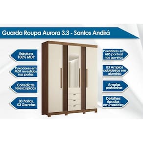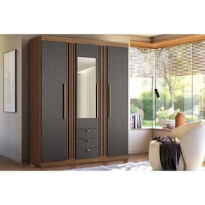 Material do Calceiro - Calceiro Metálico Tipo de Cabideiro - Aéreo Material dos Cabideiros - Cabideira Metálico Tipo de Porta do Guarda-Roupa - Portas de Bater Material das Portas - Portas em MDP Tipo de Dobradiças - Dobradiças Metálicas Diferenciais das Portas - Portas Ripadas - Porta c/ Espelho Quantidade de Portas - 3 Portas de Abrir Quantidade de Portas com Espelho - 1 Porta com Espelho Tipo de Espelho - Espelho Externo Quantidade de Espelhos - 1 Espelho Material das Gavetas - Gavetas em MDP Tipo de Corrediça - c/ Corrediças Telescópicas Quantidade de Gavetas - 3 Material de Estrutura Fundo Gaveta - Em HDF Tipo dos Pés - ABS/PVC Quantidade de Pés - 8 pés Material das Prateleiras - Prateleiras em MDP Quantidade de Prateleiras - 5