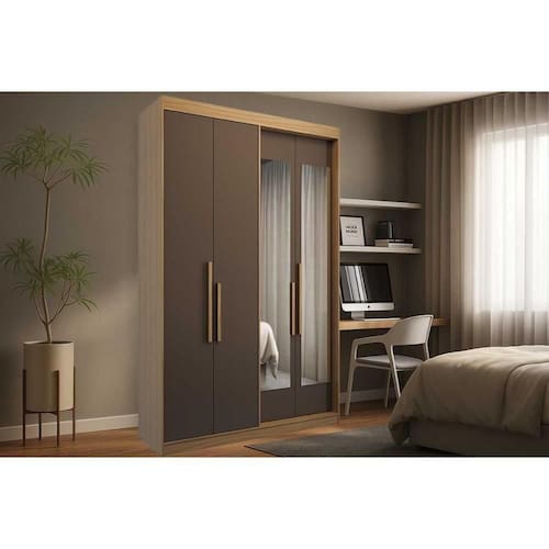 Material do Calceiro - Calceiro Metálico Tipo de Cabideiro - Aéreo Material dos Cabideiros - Cabideira Metálico Tipo de Porta do Guarda-Roupa - Portas de Bater Material das Portas - Portas em MDF Tipo de Dobradiças - Dobradiças Metálicas Diferenciais das Portas - Porta c/ Espelho Quantidade de Portas - 4 Portas de Abrir Quantidade de Portas com Espelho - 2 Portas com Espelho Quantidade de Espelhos - 2 Espelhos Material das Gavetas - Gavetas em MDF Tipo de Corrediça - c/ Corrediças Metálicas Quantidade de Gavetas - 2 Gavetas Material das Prateleiras - Prateleiras em MDP Quantidade de Prateleiras - 4
