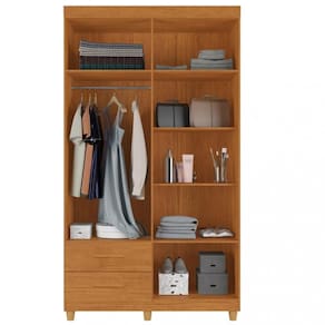 Com duas gavetas equipadas com corrediças telescópicas, este guarda-roupa oferece uma organização interna cuidadosamente planejada. Contando com um cabideiro longo em madeira, cinco prateleiras e espaço dedicado para sapatos, ele proporciona ampla capacidade de armazenamento, mantendo o ambiente sempre arrumado e sofisticado.