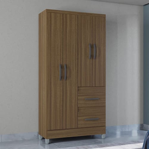 Características: Material em MDP 4 Portas 2 Gavetas 3 Prateleiras Acabamento em Pintura U.V Puxadores de Plástico Cabideiro Pés de Plástico Prateleiras que suportam até 5kg Gavetas que suportam até 3kg