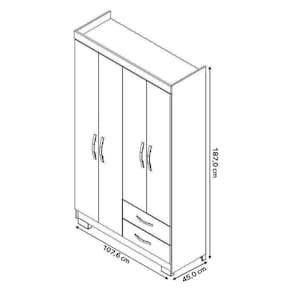 O roupeiro com 4 portas e 2 gavetas, sendo as gavetas com corrediça metálica, 3 prateleiras internas, possui 4 pesinhos, um cabideiro, puxador das gavetas e portas em plástico, produto ideal para quem está procurando algo para espaços pequenos porém com boa distribuição de espaço.