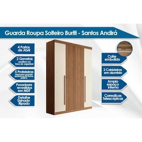 Guarda Roupa Solteiro 4 Portas (2 Ripadas e 2 c/ Espelho) e 2 Gavetas c/ Pés Buriti Jatobá - Santos Andirá