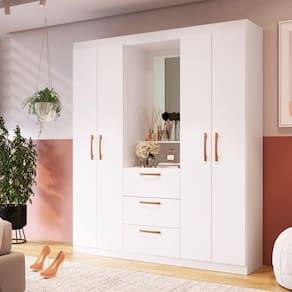 Guarda Roupa Barcelona 659000, é um roupeiro com 4 portas de bater e 3 gavetas produto com puxadores plásticos ABS, dobradiças e corrediças metálicas, acabamento interno com pintura UV, acabamento externo com pintura UV alto Brilho. Produto com boa distribuição de cabides e prateleiras, possui um espelho o qual sua fixação és com parafusos o qual já acompanha o produto. Acabamento: Pintura UV Ambiente Principal: Quarto Complexidade da Montagem: Baixa: pode ser montado por uma pessoa sozinha Cor: Branco Cor do Produto: Branco Escala de Brilho: Brilhante Itens Inclusos: 1 Guarda Roupa, Kit Ferragens e Manual de Montagem Linha ou Coleção: Classic Manual de Montagem e Instalação: https://product-hub-prd.madeiramadeira.com.br/900820/documents/1519cf35-d242-4784-b8a4-58ffa9f75d5e1872203manualgr59000.pdf Material Principal: MDP Necessita Montagem: Sim Origem do Produto: Nacional Peso: 75 kg Recomendações de Uso, Manutenção e Limpeza: Limpar com flanela levemente umedecida Sistema de Montagem: Parafusos Suporta Até (kg): 30 kg