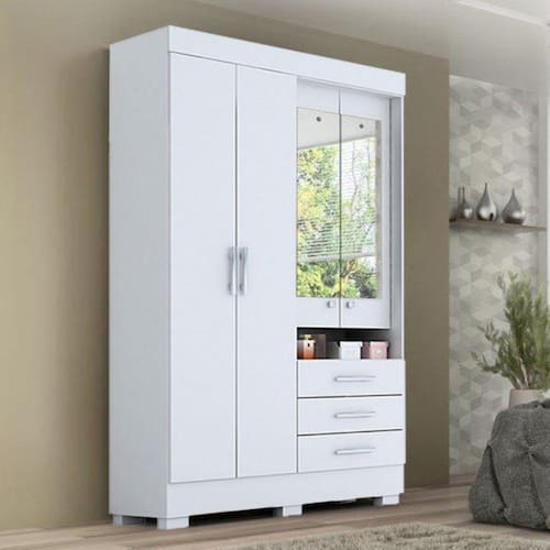 Versátil e prático, o guarda roupa Débora 4 portas com certeza da um chame ao ambiente. Possui espelhos nas 2 portas que são recuadas no modelo capelinha, que oferece beleza e sofisticação ao móvel. Conta ainda nesse espaço, com um nicho onde você pode colocar acessórios para facilitar o acesso. Produzido em 100% MDF, corrediças telescópicas metálicas nas gavetas e cabideiro em alumínio, que garante maior qualidade, tornando-o perfeito para o seu quarto.