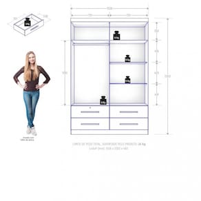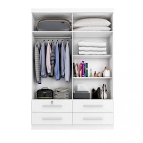 Características: 4 Portas 4 Gavetas, uma gaveta com chave e tambor de aço Puxadores em MDF Corrediças telescópicas Cabideiro metálicos Estrutura MDP 15mm Gaveta suporta peso de até 3kg