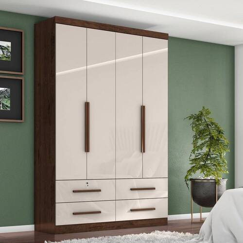 Características: 4 Portas 4 Gavetas, uma gaveta com chave e tambor de aço Puxadores em MDF Corrediças telescópicas Cabideiro metálicos Estrutura MDP 15mm Gaveta suporta peso de até 3kg