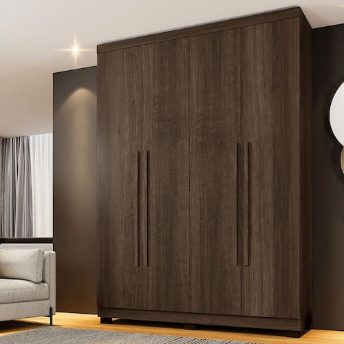 Características: 4 Portas 3 Gavetas Corrediças telescópicas Cabideiro em alumínio Puxadores na mesma tonalidade do produto Pés inclusos 8 prateleiras e nichos