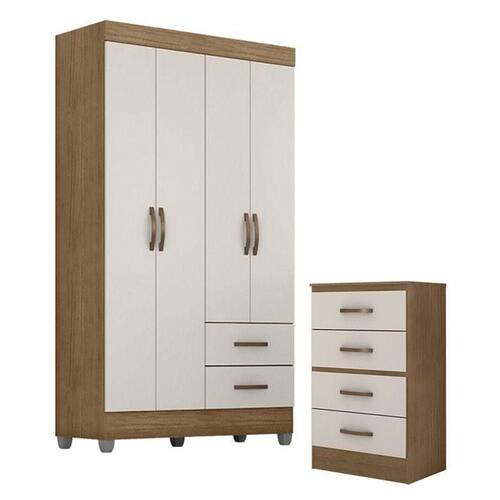 Guarda Roupa Solteiro 4 Portas e Cômoda 4 Gavetas Lite Nature Off White Móveis Leão