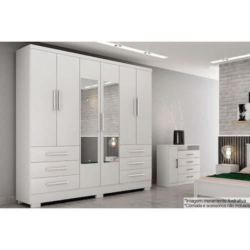 Guarda Roupa Solteiro 6 Portas (2 c/ Espelho) e 6 Gavetas c/ Pés Encanto/Berlim Branco - Novo Horizonte