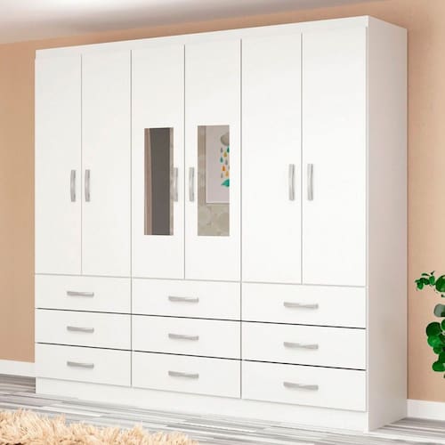 O(a) Guarda-Roupa Solteiro 6 Portas 9 Gavetas com Espelho Branco - Evidencia Móveis é produzido em MDP na escala de brilho Fosco, e possui um grau de dificuldade de montagem: Médio.