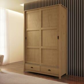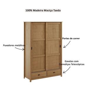 Características: Estrutura em Madeira Maciça Pinus Taeda de reflorestamento Pintura Semi-brilho 02 Portas de correr 02 Gavetas com corrediças telescópicas (peso máximo suportado 05kg distribuídos) Cabideiros em alumínio (peso máximo suportado 08kg distribuídos) Puxadores metálicos em ouro envelhecido Pés alongados em madeira Amplo espaço para armazenamento Prateleiras maciças (peso máximo suportado 10kg distribuídos)
