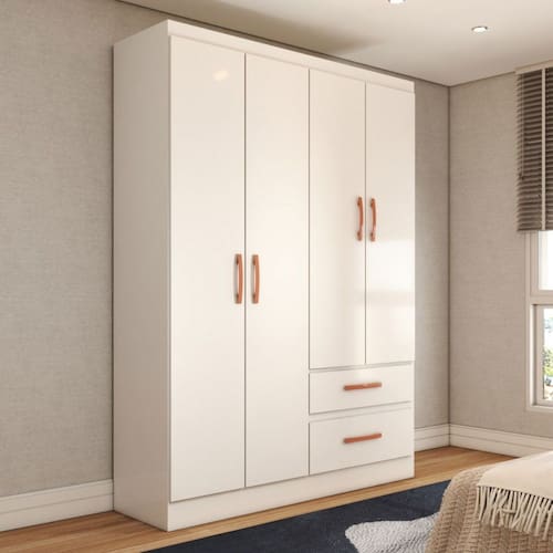 O(a) Guarda-Roupa Solteiro Boulevard 4 Portas 2 Gavetas Branco - Loja é produzido em MDP na escala de brilho Semi-Brilho, e possui um grau de dificuldade de montagem: Médio.