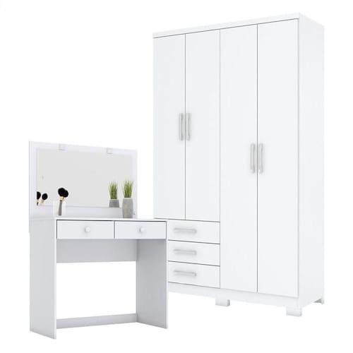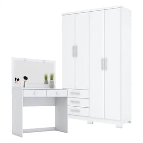 Guarda Roupa Solteiro Caju 4 Portas e Penteadeira Daila com Led Branco - Henn