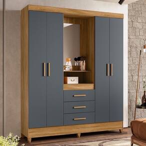 Guarda Roupa Solteiro Capelinha Capri 4 Portas E 3 Gavetas Freijó/cinza Com Espelho - Moval Freijó/cinza Guarda Roupa Solteiro Capelinha Capri 4 Portas e 3 Gavetas com Espelho - Moval O Guarda-Roupa Solteiro Capelinha Capri 4 Portas e 3 Gavetas com Espelho é a escolha ideal para quem busca organização e praticidade com um toque clássico. Produzido em MDP com pintura UV, oferece resistência e durabilidade. Suas quatro portas possuem puxadores em MDF, e a capelinha central com espelho traz funcionalidade e charme ao móvel. Conta com três gavetas com corrediças metálicas para facilitar a organização de pequenos itens, além de prateleiras internas que garantem melhor aproveitamento do espaço. O cabideiro e o calceiro em alumínio proporcionam mais praticidade no armazenamento das roupas, enquanto os pés em PVC oferecem estabilidade e segurança. ESPECIFICAÇÕES: - Estrutura em MDP - Pintura UV - 4 Portas - Dobradiças metálicas - 3 Gavetas - Corrediças metálicas - Interna com prateleiras - Cabideiro e calceiro em alumínio - Capelinha central com espelho - Puxadores em MDF - Pés em PVC
