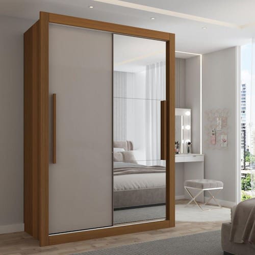O(a) Guarda-Roupa Solteiro Cardiff 2 Portas 2 Gavetas com Espelho Cinamomo/Off White - Loja é produzido em MDF e MDP na escala de brilho Brilho, e possui um grau de dificuldade de montagem: Médio.