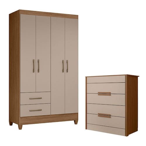 Organize seu quarto com elegância e o melhor custo benefício do mercado. Apresentamos o Guarda Roupa Solteiro Chile e Cômoda Dhara fabricados pela Moval. Guarda Roupa com 04 portas e 02 gavetas com corrediças metálicas, puxadores na cor bronze, cabideiro em madeira para melhor organização interna, espaço ideal para roupas longas e pés em PVC. A cômoda possui 04 gavetas com corrediças telescópicas, moldura lateral de 25mm, tampo de 15mm, puxadores em MDF, pés em PVC e um design moderno que combina com qualquer decoração. Fabricado com materiais de alta qualidade que garante resistência e durabilidade ao produto. Confira mais detalhes e aproveite!