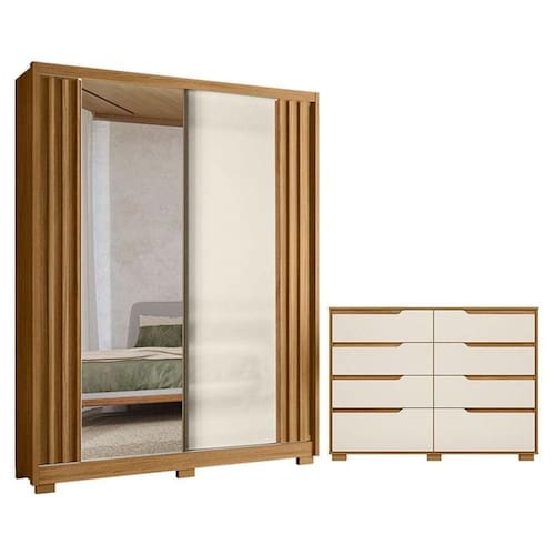 Está procurando móveis para seu quarto? Apresentamos para você este belo conjunto composto pelo guarda roupa da linha Colorado e a cômoda da linha Georgia. O guarda roupa possui duas portas deslizantes, sendo uma delas com espelho e o seu design é valorizado com os detalhes ripados em MDF nas laterais. Internamente, conta com três gavetas. Complementando o conjunto, a cômoda apresenta oito gavetas espaçosas. Os puxadores usinados agregam um visual mais clean. Tanto o guarda roupa quanto a cômoda possuem corrediças telescópicas e pés em PVC. Fabricados pela Moval, são desenvolvidos em MDP, ideal para quem busca organização sem abrir mão da qualidade, praticidade e estilo para transformar seu quarto. Aproveite e garanta já o seu!