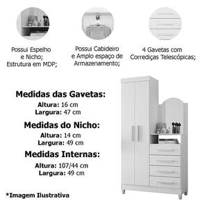 Características do Guarda-Roupa com Cômoda Capri: - Estrutura em MDP; - Puxadores em MDF revestidos; - Acabamento de pintura em UV padrão; - 2 portas com dobradiças metálicas; - 4 Gavetas; - Prateleira; - Acompanha Pés; - Espelho curvo 0,60x0,39m; - Não acompanha objetos decorativos; - Montagem por conta do comprador;