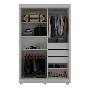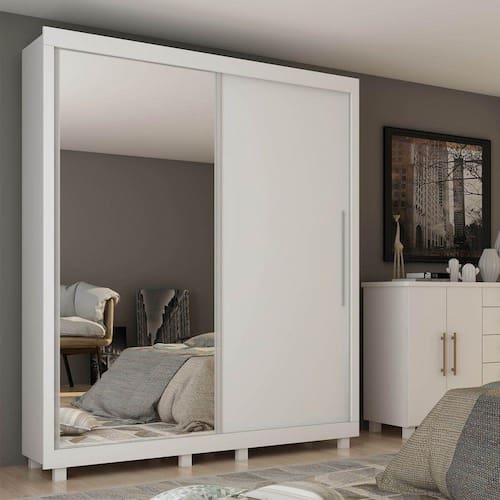 O Guarda Roupa Solteiro com Espelho 2 Portas 3 Gavetas Royale Gelius agrada pelo seu design compacto e arrojado e portas reversíveis o que possibilita até mais opções de montagem. Se destaca pela praticidade das 2 portas de correr, que contribuem para a otimização de espaço, contando com um amplo espaço interno, onde sua estrutura é formada por 3 gavetas, 4 prateleiras e espaço para vestidos e calças. O roupeiro Royale conta também com porta lateral de espelho trazendo mais sofisticação ao produto.
