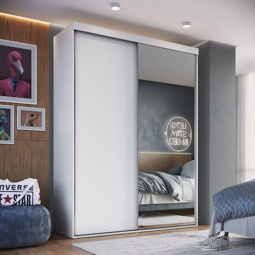 Este Guarda Roupa Emovell possui amplo espaço interno. Design contemporâneo e cores diferenciadas que se harmonizam facilmente com todos os estilos de ambientes. Produto com alta resistência desenvolvidos 100% em MDP, com o objetivo de atender todas as suas necessidades. Acabamento da Prateleira: BP Melamínico Escala de Brilho da Prateleira: Fosco Possui Cabideiros: 02 Acabamento da Gaveta: BP Melamínico Escala de Brilho da Gaveta: Fosco Possui Organizador de Gaveta: Não Acabamento da Porta: BP Melamínico Escala de Brilho da Porta: Fosco Material do Puxador da Porta: Alumínio Altura do Espelho: 209,5 cm Ambiente Principal: Quarto codigo_ean: 7909903933671 Complexidade da Montagem: Média: pode ser montado por mais de uma pessoa e/ou necessite de maior conhecimento para montagem Cor: Branco Cor do Produto: Branco Cor Flex: Não Cor Interna: Branco Escala de Brilho: Fosco Espessura do Espelho: 3 mm Formato do Espelho: Retangular Gaveta com Chave: Não Guarda-Roupa Suporta Até (kg): 60 kg Itens Inclusos: 1 roupeiro e manual de montagem Largura do Espelho: 73 cm Linha ou Coleção: Guarda-Roupa Solteiro Manual de Montagem e Instalação: https://product-hub-prd.madeiramadeira.com.br/950670/documents/d34e844e-171b-4773-90d3-4a15276228282363790522517269189729875.pdf Material da Gaveta: MDP Material da Porta: MDP Material da Prateleira: MDP Material Principal: MDP modular: Não Montagem Flex: Não Necessita Montagem: Sim Origem do Produto: Nacional Peso: 132,1 kg Peso Máximo por Gaveta: 3 kg Peso Máximo por Prateleira: 5 kg Possui Calceiros: Não Possui Espaço para Vestidos Longos: Não Possui Espelho: Sim Possui Espelho Interno: Não Possui Ganchos: Não Possui iluminação: Não Possui Nichos: Não Possui Painel de TV: Não Possui Pés: Não Possui Portas: Sim Possui Prateleiras: Sim Possui Sapateira: Não Produto Montado: Sim Quantidade de Espelho: 01 Quantidade de Gavetas: 02 Gavetas Quantidade de Prateleiras: 05 Prateleiras Recomendações de Uso, Manutenção e Limpeza: Para a limpeza do móvel utilizar uma flanela seca. Sistema de Montagem: Parafusos, cavilhas e minifix Suporta Até (kg): 60 kg Tipo de Corrediça da Gaveta: Metálica Telescópica Tipo de Dobradiça/Corrediça da Porta: Alumínio Tipo de Fixação do Espelho: Silicone Tipo de Gaveta: Interna Tipo de Guarda-Roupa: Solteiro Tipo de Puxador da Gaveta: Não Possui Tipo de Puxador da Porta: Embutido Marca: Emovell