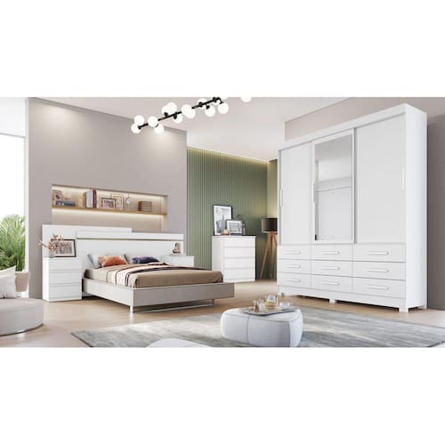 Particularidades do guarda-roupa: Características: - 100% MDP; - Puxadores com acabamento amadeirado; - 9 Gavetas com corrediças telescópicas; - Espelho parafusado; - Trilho inferior em alumínio; - Roldanas com rolamento; - Cabideiros em alumínio; - Pés inclusos;