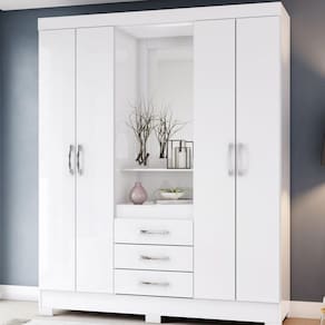 O guarda-roupa Nápole 04 Portas 03 Gavetas une design e funcionalidade. O ambiente fica aconchegante e moderno. Foi desenvolvido para oferecer praticidade no seu dia-a-dia, possui espelho, 4 portas e 3 gavetas é compacto mas espaçoso, perfeito para a organização das roupas. Tem altura de 2000mm, largura de 1630mm e profundidade de 465mm. Os puxadores são de ABS cromado, os cabideiros de madeira são revestidos. Produzido em MDP e pintura UV. Proporciona muito mais comodidade na hora de organizar suas roupas.