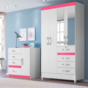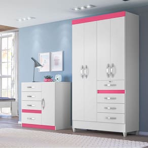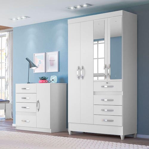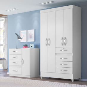 ESPECIFICAÇÕES TÉCNICAS: - Material: MDF; - Acabamento: Pintura UV; - Número de Portas: 4 Portas; - Número de gavetas: 4 gavetas; Suporta até (kg): 5Kg ( Por Prateleiras) - Produto Precisa de Montagem? (Sim/Não): Sim; - Garantia: 6 Meses; - Instruções de Cuidado: limpar o produto com flanela ou pano macio seco; - Dimensões do Produto (LarguraXProfundidadeXAltura): 111x47x204cm - Conteúdo da Embalagem (1 Guarda Roupa - Entregue: 3 Volumes)