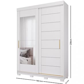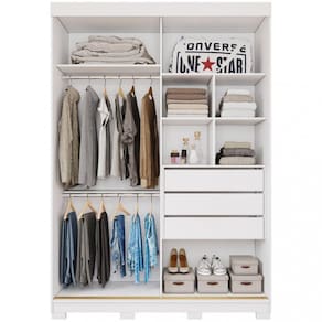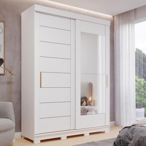 Características: Estrutura em MDF Acabamento em Pintura UV 2 Portas de correr 3 Gavetas Corrediças telescópicas Cabideiros em alumínio com suporte metálico Puxadores em alumínio Pés em ABS Opção de montagem flex