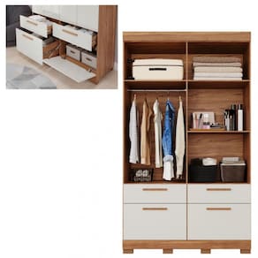 Características: 2 Gavetas e 2 gavetão com corrediças telescópicas 4 Portas 3 Prateleiras Acompanha espelho interno Cabideiro em alumínio Estrutura 100 em MDF Possui pés Puxadores em MDF