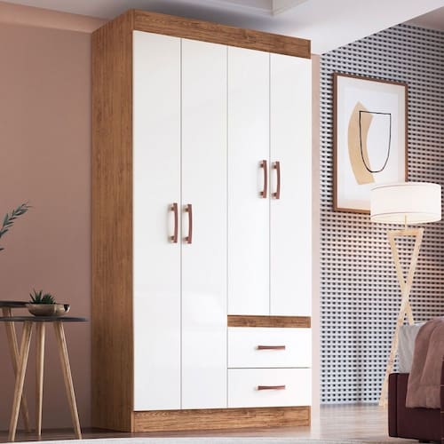 O(a) Guarda-Roupa Solteiro Cordova 4 Portas 2 Gavetas Off White Nogueira - Doripel é produzido em MDP na escala de brilho Semi-Brilho, e possui um grau de dificuldade de montagem: Médio.